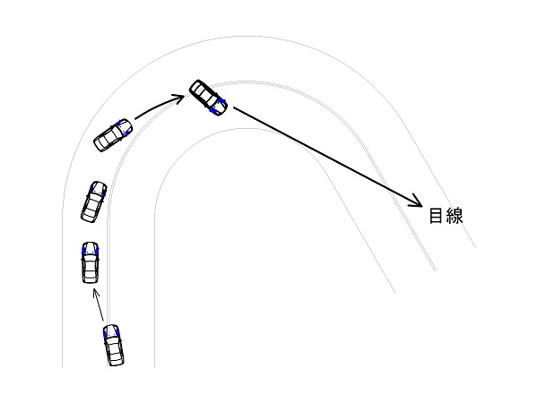 そしてアクセルを踏んでコーナーのアウト側を立ち上がっていきます。アクセルを踏むとカウンターを多く当てるためアウト側に膨らんでいきます。適度なところでアクセルを緩めながらコントロールしてください。