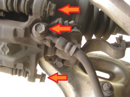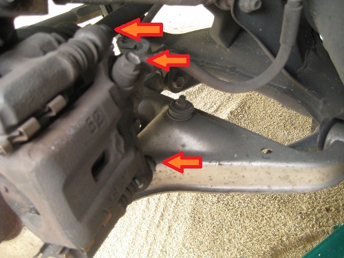 矢印の部分のネジを外します。真ん中の矢印のネジはブレーキホースのネジです。ブレーキパット交換のみの場合は外す必要はありません。今回はブレーキホースもついでに交換しますので外しました。 このような部品を固定しているネジはとても強く締め付けられています。普通に緩めるとなかなか緩みません。コツとしては一気に緩めますが、その瞬間に工具を手のひらで緩める方向にたたきます。インパクトレンチの人間バージョンみたいな感じです。