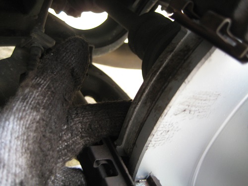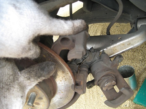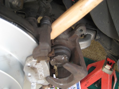 キャリパーをブレーキディスクから引き抜きます。