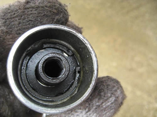 ピストンに溝が切ってあるので、この溝に工具を引っ掛けて左に回転させてください。専用工具があるのですが、わざわざ購入する必要はありません。ラジオペンチで外せます。