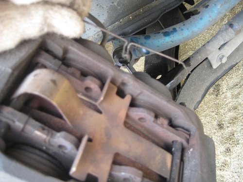 最初にキャリパーの内側についている針金みないな物を外します。ブレーキパットを固定しているピンが抜けないようにしている物です。