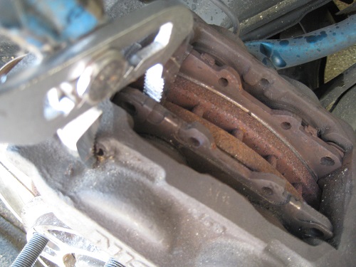 ピストンを押し戻せば簡単に外れます。ブレーキパットについている金具は再利用しますのでなくさないようにしてください。その後はブレーキホースとブレーキキャリパーを外します。