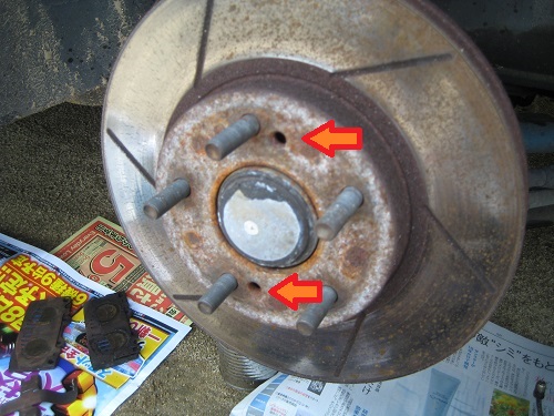 ブレーキディスクも外します。リヤと同じでネジ(タップ)があるので、ここに合うネジを入れて締め付けてください。2箇所交互に締めこむと外れます。