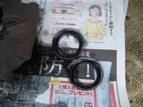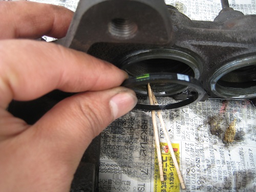逆の手順で新しいパッキンを入れます。ここでシリンダの中を確認してください。何かのカスみたいな硬いかけらが落ちているかもしれません。私のは落ちていました。たぶんこれはグリスの硬化したものだと思います。