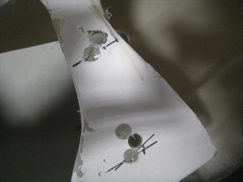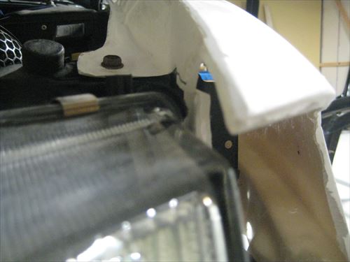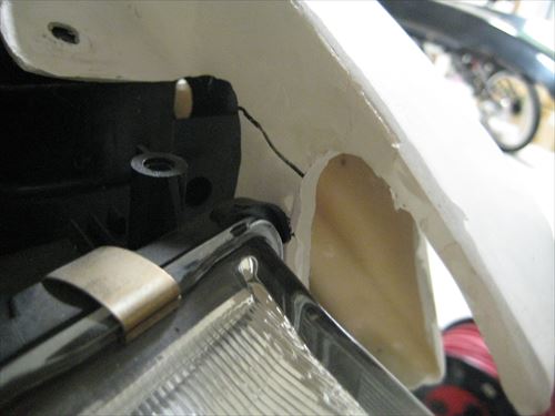 今度は右側のフェンダーです。こちらのヘッドライトの位置は問題なかったのですが、取り付け用の穴の位置が全然違います。一度FRPで埋めて再度穴を開け直しました。写真の灰色の部分が埋めた位置です。まあ埋める必要はなかったのですが、なんとなく埋めてみました。