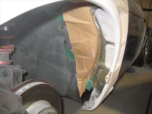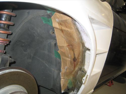 次にフェンダー内に適当な紙やダンボールを貼り、ガムテープで表面を覆います。その上からFRPを貼り付けていきます。