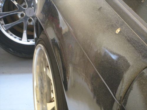 このシルビア、リアにブリスターフェンダーを貼り付けているのですが、パテ埋めしている部分が割れています。さらに前から見るとドアの後ろから突然広がっています。
