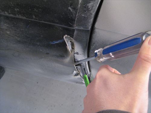 切れ込みを入れた内側のフェンダーを表面にめくり上げます。表面に出てきた部分に穴を開けます。