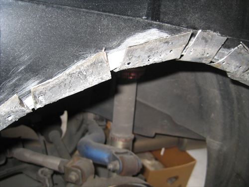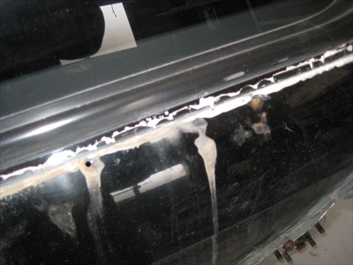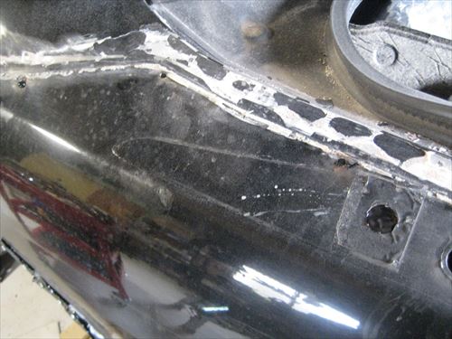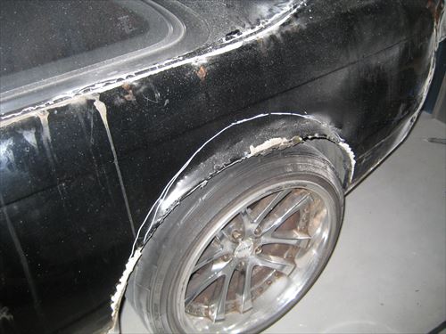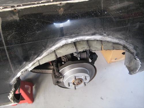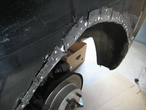後はそのままドリルネジで締めてしまうのですが、本来はその後溶接して内側と外側のフェンダーをしっかり固定します。ボディーの強度を保つためです。 ただ今回は溶接機が無いため代わりにパネルボンドを使用してみました。このボンドは溶接並みの接着力と書いてあったので使用しました。値段はものすごく高価です。 さらに専用のコーキングガンも必要になります。今回コーキングガンは適当に製作しました。