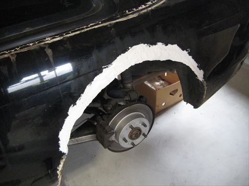 外したフェンダーの取り付けに入ります。このフェンダーは外した後一回り小さくカットしています。ボディとパテ埋めするとき、自然な感じに仕上げるためです。 ここで問題が発生しました。右側のフェンダーは給油口があるため、ちゃんとオーバーフェンダーになっています。しかし左側は給油口などの支えが無く単純に上から貼り付けるだけです。 そのためそのままボディに貼り付けてもほとんどフェンダーが出てくれません。材料の厚み分が出ているだけです。もともと左右で出る寸法が違っていたのはこのせいでしょう。