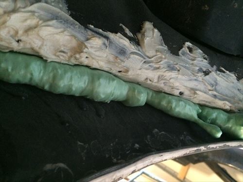 これは発砲ウレタンです。シリコンコーキングをするのですが、隙間が広すぎて上手にぬれないため、あらかじめ発砲ウレタンでふさぎました。